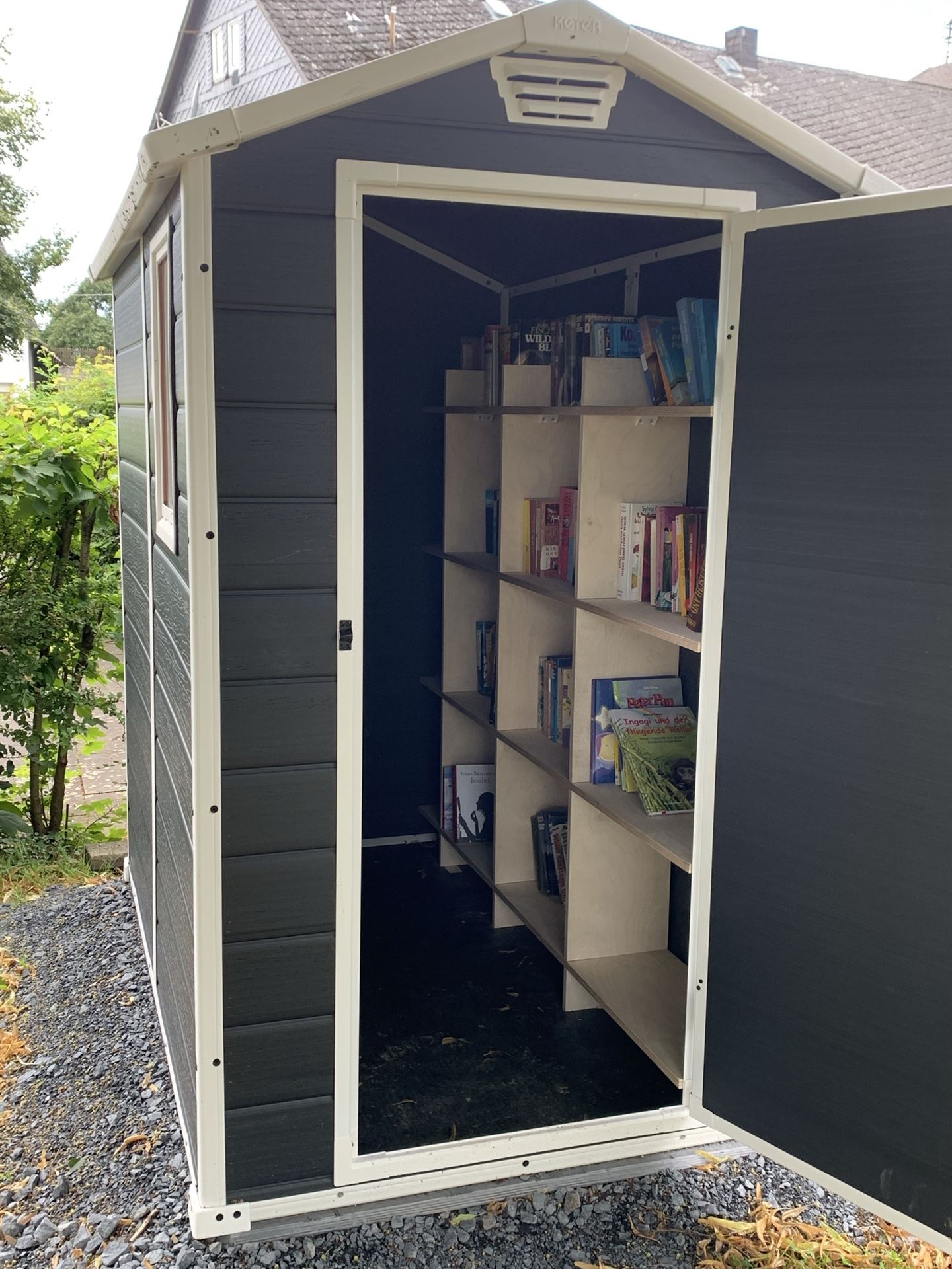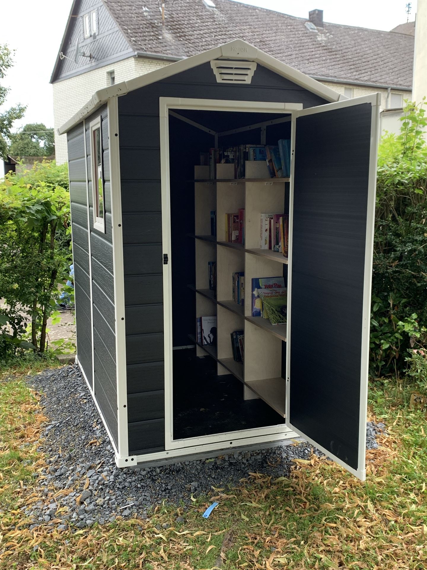 Da die Büchertauschkisten erfreulich rege genutzt wurden aber oft unter Wetterwidrigkeiten litten, wurde vom Bürgerverein ein „Büchertauschhäuschen“ angeschafft und am Brunnen aufgestellt.